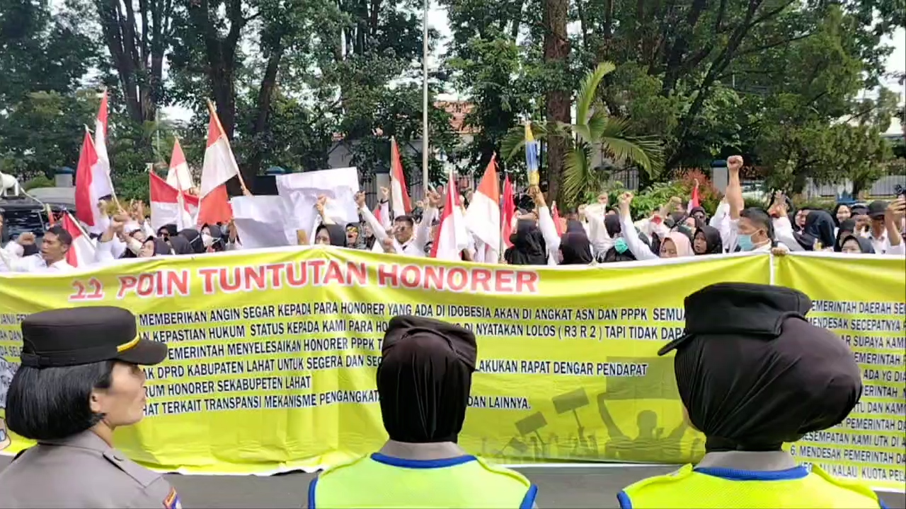 Lahat, BSS – Lebih dari seribu Tenaga Honorer Kabupaten Lahat Sumatera Selatan menggelar aksi unjuk rasa di halaman Kantor Pemerintah Kabupaten dan Gedung DPRD Kabupaten Lahat, aksi ini dilakukan untuk menyuarakan tuntutan terkait pengangkatan sebagai Pegawai Pemerintah dengan Perjanjian Kerja (PPPK) dan dugaan adanya sejumlah oknum “Honorer Siluman” yang diangkat sebagai PPPK.